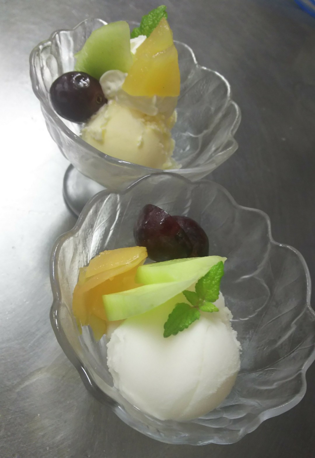 パニラアイス グレープフルーツシャーベット プレーンシフォンケーキ あんみつ