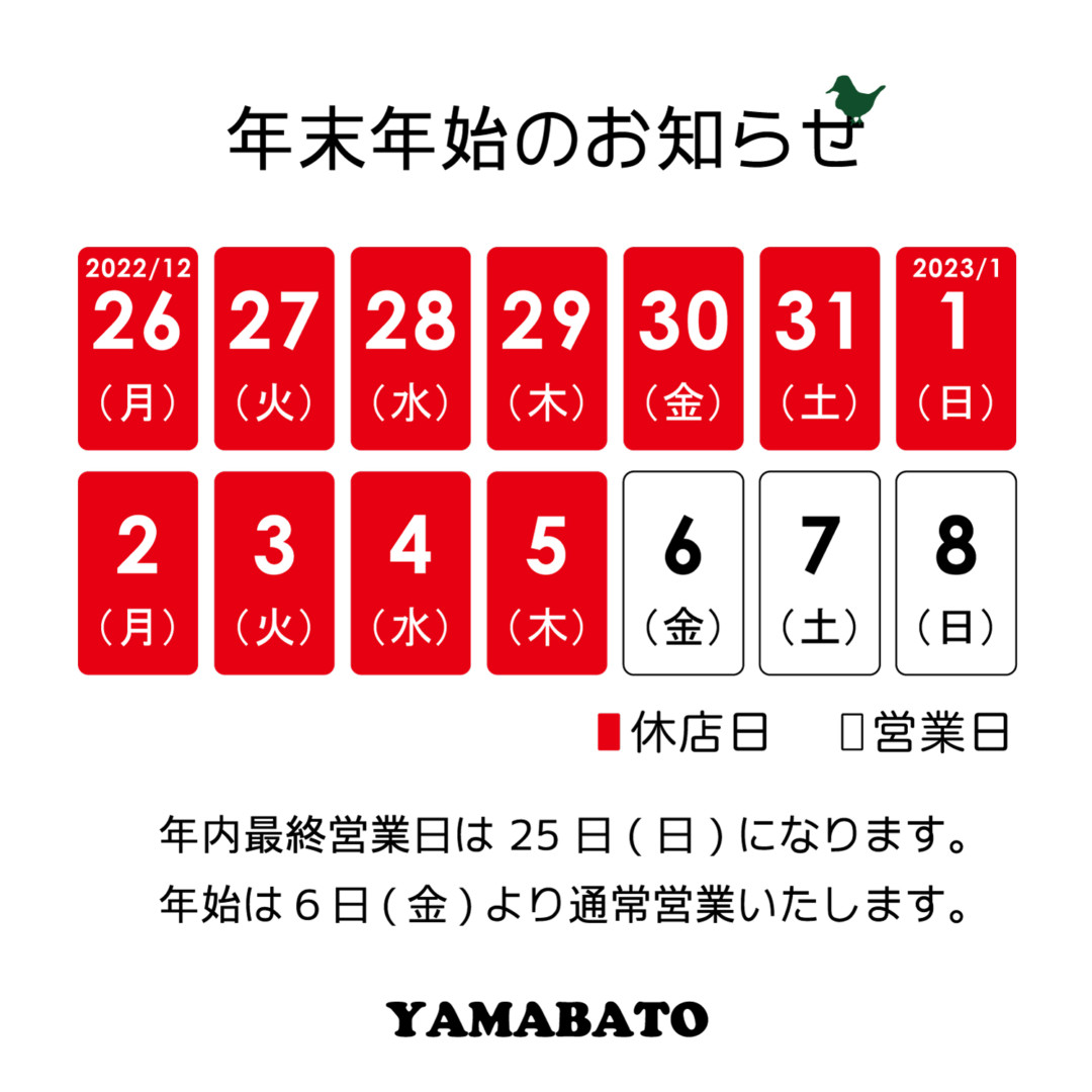 いつも山鳩をご利用いただきありがとうございます。 年内最終営業日は25日(日)、年始は6日(金)より通常営業い…