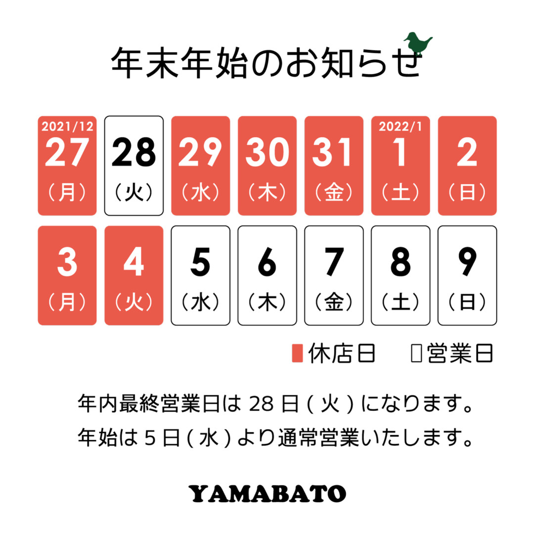 いつも山鳩をご利用いただきありがとうございます。 年内最終営業日は28日(火)、年始は5日(水)より通常営業い…