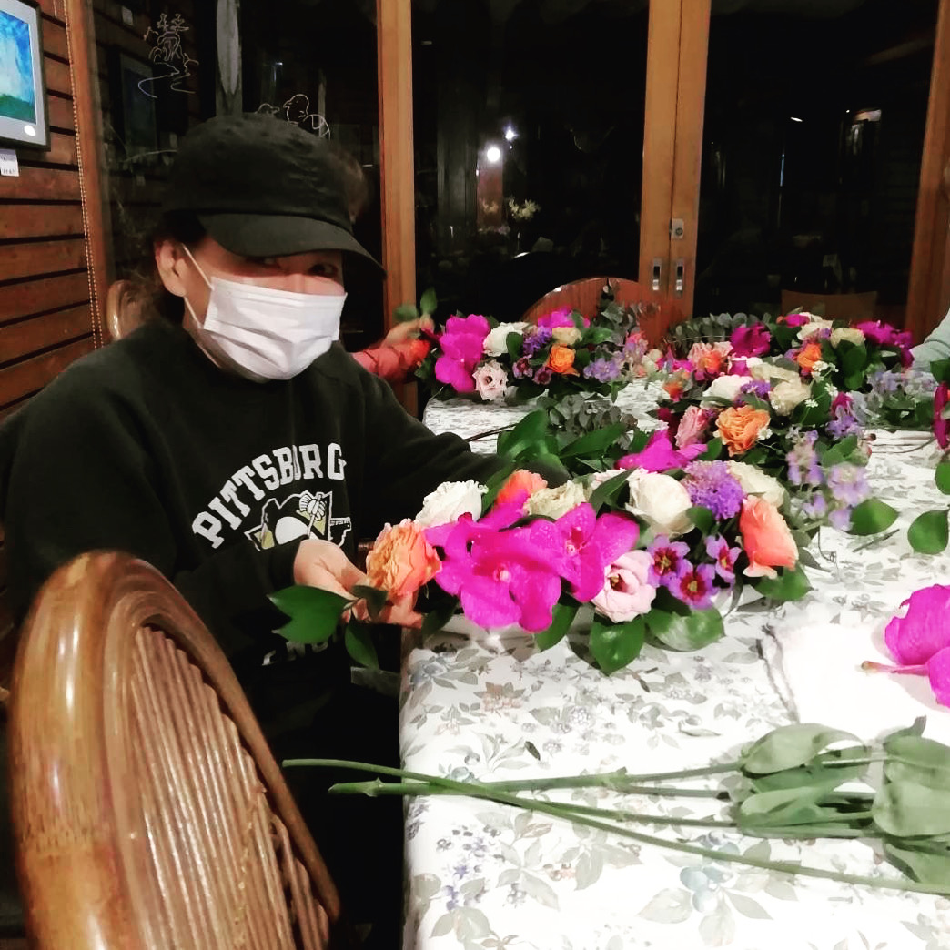 山鳩では月に2回、閉店後のお店でフラワーアレンジメントのワークショップを行っています。青梅の「花かいどう」より…