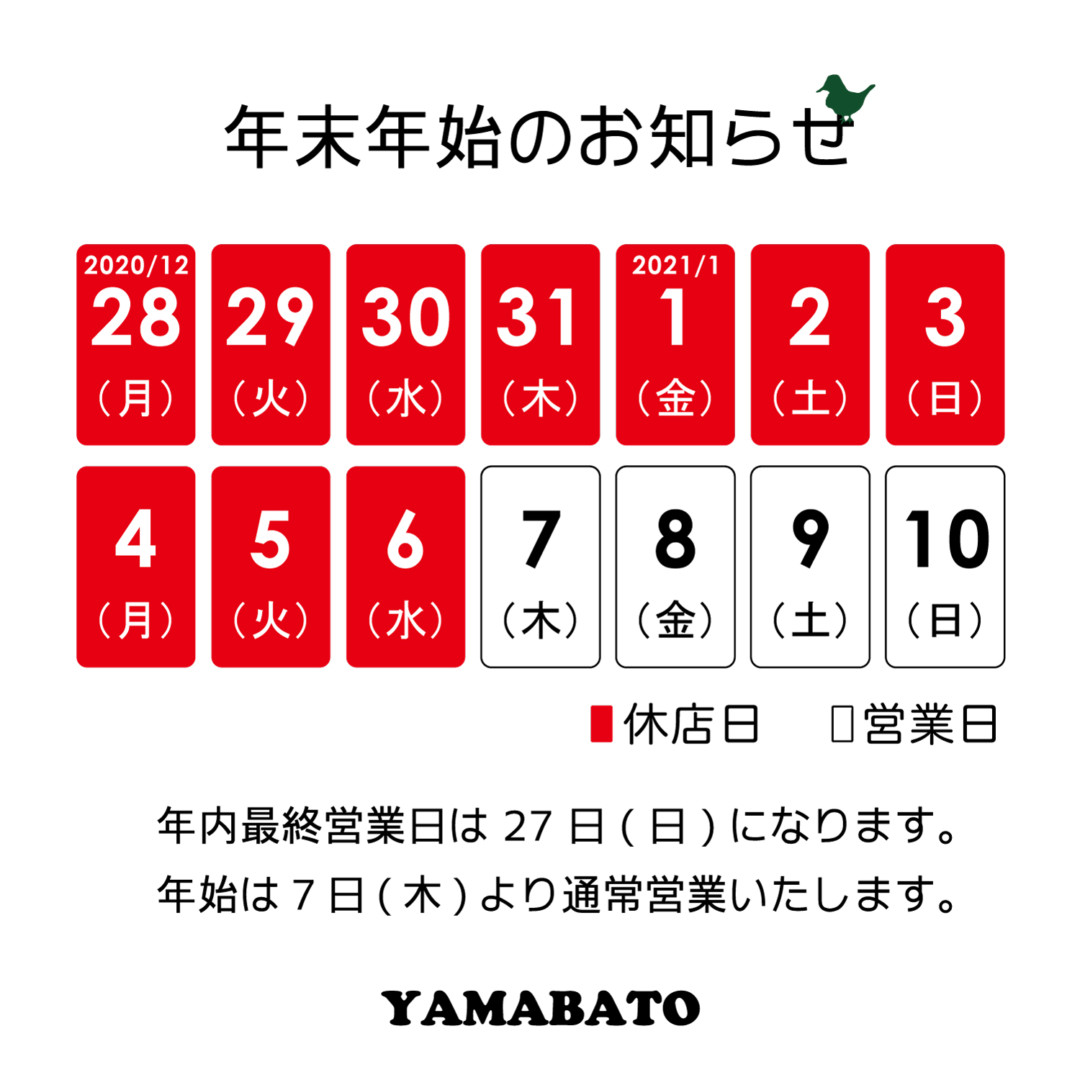 いつも山鳩をご利用いただきありがとうございます。誠に勝手ながら12月28日(月)〜1月6日(水)まで、お休みさ…