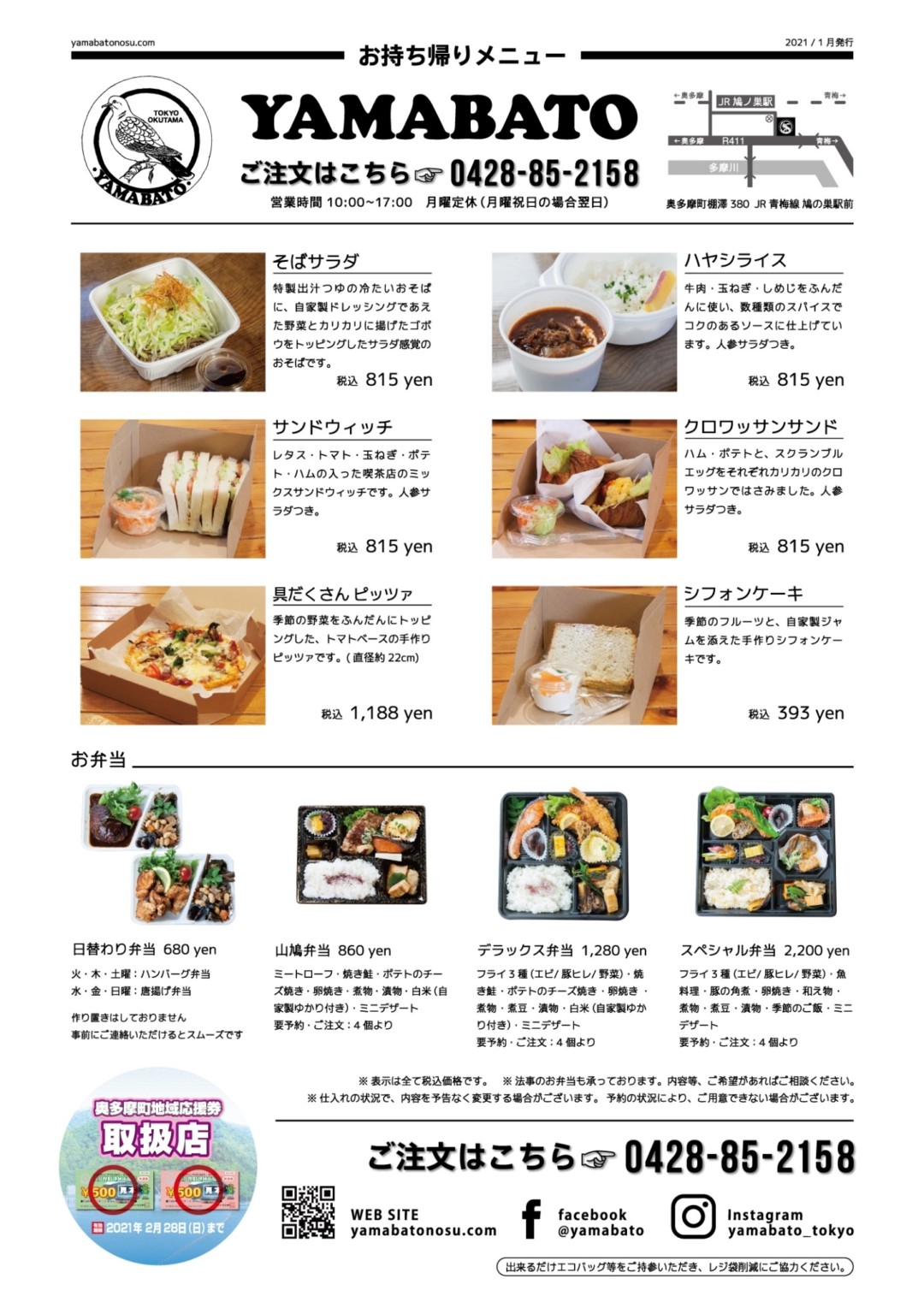 山鳩のお持ち帰りメニューです。本日の朝刊にも入っています。 通常のメニューに加え、お弁当も各種ございます。ぜひ…